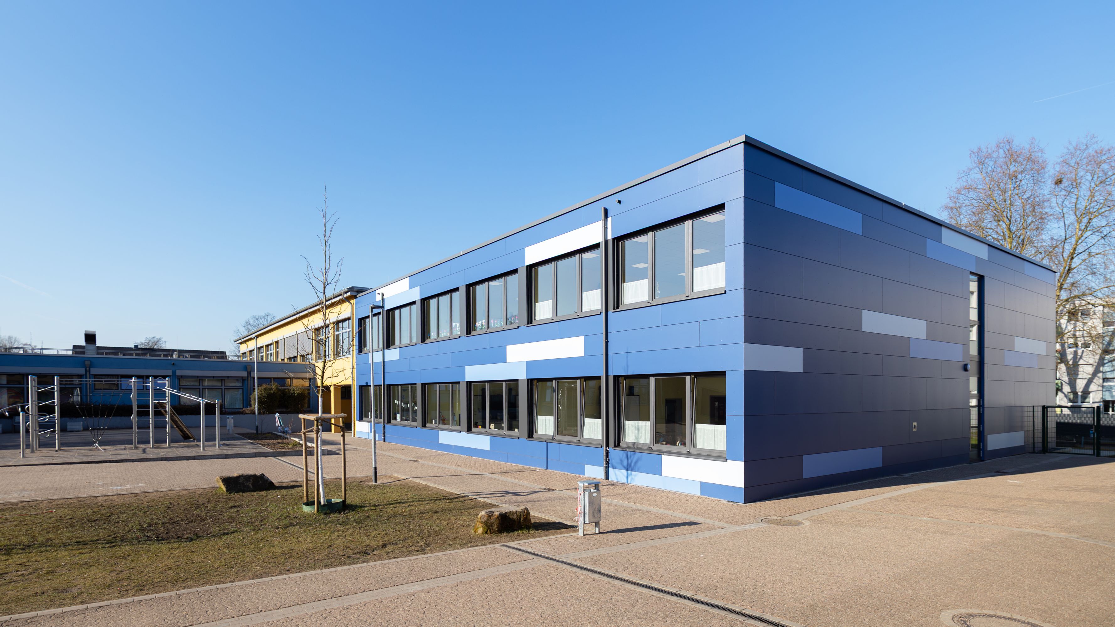 Im ersten Bauabschnitt wurde ein neuer Gebäudeteil mit einer neuen Pausenhalle und mit vier Klassenräumen, zwei OGS/Differenz- und Förderungsräumen sowie einem neuen Treppenhaus mit Aufzugsanlage errichtet. Im Obergeschoss wurde eine Verbindung zum neuen Klassentrakt geschaffen. Auch im OG sind einzelne Wände entfernt worden sowie neue Türen, als Sichtverbindung zwischen den Klassenräumen, errichtet worden. Auch im Außenbereich sind Anpassungen gemacht worden. So entstanden ein Fahrradstellplatz, ein Müllstellplatz, ein barrierefreier Stellplatz und zwei barrierefreie Rampen (Pausenhalle). Durch den Abbruch der Treppenanlagen entstanden im Bereich der neuen Pausenhalle zwei neue Anlagen.