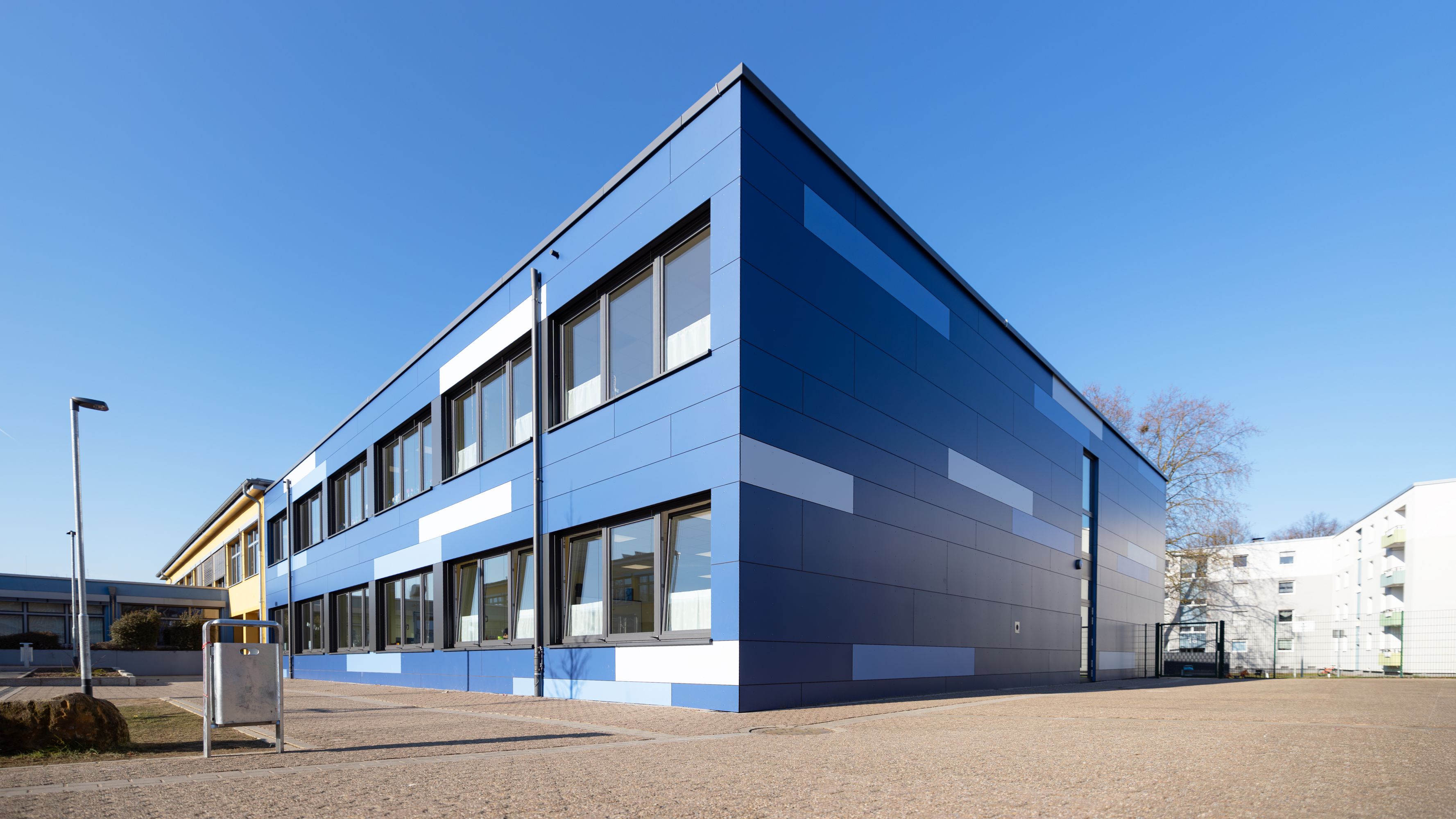Im ersten Bauabschnitt wurde ein neuer Gebäudeteil mit einer neuen Pausenhalle und mit vier Klassenräumen, zwei OGS/Differenz- und Förderungsräumen sowie einem neuen Treppenhaus mit Aufzugsanlage errichtet. Im Obergeschoss wurde eine Verbindung zum neuen Klassentrakt geschaffen. Auch im OG sind einzelne Wände entfernt worden sowie neue Türen, als Sichtverbindung zwischen den Klassenräumen, errichtet worden. Auch im Außenbereich sind Anpassungen gemacht worden. So entstanden ein Fahrradstellplatz, ein Müllstellplatz, ein barrierefreier Stellplatz und zwei barrierefreie Rampen (Pausenhalle). Durch den Abbruch der Treppenanlagen entstanden im Bereich der neuen Pausenhalle zwei neue Anlagen.
